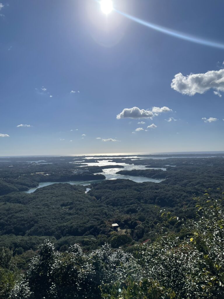 青い空と穏やかな海、入り組んだリアス海岸が一望でき、